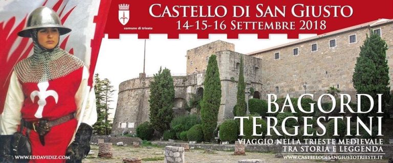 Partenza dunque venerdì 14 settembre alle ore 17.00 al Castello di San Giusto nella storia e nella leggenda della Trieste medievale in un evento curato dall’Associazione Tredici Casade, dalla società veneziana Wavents e dal Consorzio Europeo di Rievocazioni Storiche con la partecipazione di Arcieri di Trieste (A.S.D. Archery Team), Cantori delle Tredici Casade, Clamor et Gaudium, Cavalieri del Drago, Cinghiali Tergestini, Danza & Più, Falconieri del Re, Gaelicus Academy, Giullare Tornello, Locanda dell’Aquila Nera, Mercato e mestieri di Santa Giustina, Associazione Per la Storia, Schola Tamburi Storici di Conegliano Veneto, Teatrobàndus. Agli eventi in programma venerdì 14 dalle 17.00 alle 21.00, faranno seguito quelli di sabato 15 settembre dalle 10 alle 21 e quelli di domenica 16 settembre dalle 10.00 alle 14.00. Si accede con il biglietto di ingresso la Castello di San Giusto, comprendente la visita al Civico Museo del Castello di San Giusto – Armeria e al Lapidario Tergestino al Bastione Lalio: intero euro 3,00; ridotto euro 2,00.