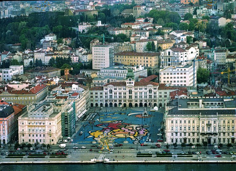 Nel mese di marzo 2020 ricorre il ventennale del mega-graffito dedicato a Trieste e al mito di Europa in Piazza Unità d’Italia, realizzato da Bruno Chersicla con la partecipazione di 4.572 volontari ed entrato nel Guinnes dei primati come dipinto più grande del mondo. Realizzato con l’impiego di 4 tonnellate di colore, per un’estensione di oltre 10.000 metri quadrati, il graffito – straordinario per le dimensioni, l’invenzione e le modalità di realizzazione – è ispirato al Ratto d’Europa, qui identificata (e quindi idealmente unita) alla personificazione di Trieste, trasportata dal mitologico toro. Armata di lancia alabardata, essa esprime la sua vocazione economica in qualità di porta d’Oriente, quest’ultimo evocato dalla mezzaluna e dal sol levante, all’interno di una enorme cornice azzurra dal profilo orientale, costellata dalle stelle simboliche dell’Europa Unita.