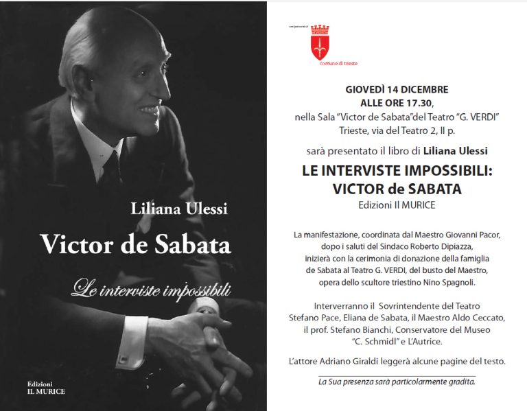 In occasione del cinquantesimo anniversario della scomparsa del Maestro Victor de Sabata, al quale il Teatro alla Scala dedicherà una mostra, la famiglia del Maestro ha avuto l’opportunità di acquistare dalla vedova dello scultore triestino Nino Spagnoli il busto di Victor de Sabata, che aveva portato a termine quale sua ultima opera.La figlia, Eliana de Sabata, ha deciso di farne dono alla città di Trieste, in ricordo del padre che amava profondamente la sua città. Pertanto, giovedì 14 dicembre, nella Sala “Victor de Sabata” del Teatro Lirico “Giuseppe Verdi”, si terrà la consegna ufficiale dell’opera, realizzata dallo scultore Nino Spagnoli, e che rimarrà collocata in tale sede.