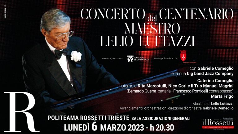 Il “Concerto per il centenario del Maestro Lelio Luttazzi”, promosso dalla Fondazione Lelio Luttazzi in co-organizzazione con il Comune di Trieste, si svolgerà lunedì 6 marzo alle ore 20.30 nella Sala Assicurazioni Generali del Teatro Stabile del Friuli Venezia Giulia – IlRossetti a ingresso libero, con apertura delle porte dalle ore 20.00.