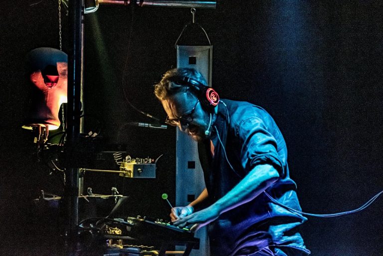 LA MACCHINA – GLI STRUMENTI il corpo e la voce dell’attore animano una “macchina infernale”: una struttura scarna di tubi innocenti che fa da scheletro ad una serie di strumenti artigianali. Una lamina in acciaio armonico elettrosaldata e sospesa, una lamiera piegata e tagliata che monta corde di basso, tre diverse loopstation, una originale testa Binaurale che permette una spazializzazione del suono a 360 gradi, nove microfoni, lunghi tubi in rame che montano bocchini da soprano, diversi Delay, riverberi, flauti, strani clarinetti, una barra in acciaio, due mixer, una multi effetti per la voce oltre a elementi come acqua, pietre, legni e alcuni ortaggi. Materiali e strumenti percossi, sfiorati, graffiati e fatti risuonare dal vivo così da comporre una complessa struttura sonora sulla quale poggiare la potenza evocativa del verso.