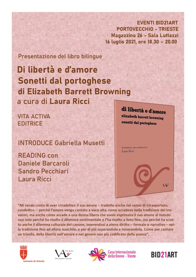 L’incontro di BID21ART sarà dunque un’imperdibile occasione per recuperare e gustare la colta, appassionata e ironica modernità dei versi della poetessa inglese, sia nell’originale che nella traduzione da poeta a poeta di Laura Ricci, che opera una ricreazione di questo celebre canzoniere tenendo ben presente l’entusiastica vitalità dei versi di E.B.B e quanto, in essi, l’amore venga cantato a voce alta per esprimere sia il valore salvifico e il lieto fine della storia sentimentale, sia la libertà che la poetessa si prende, in piena epoca vittoriana, nel superare e rinnovare in modo estremamente personale e moderno la tradizione letteraria dei canzonieri d’amore.