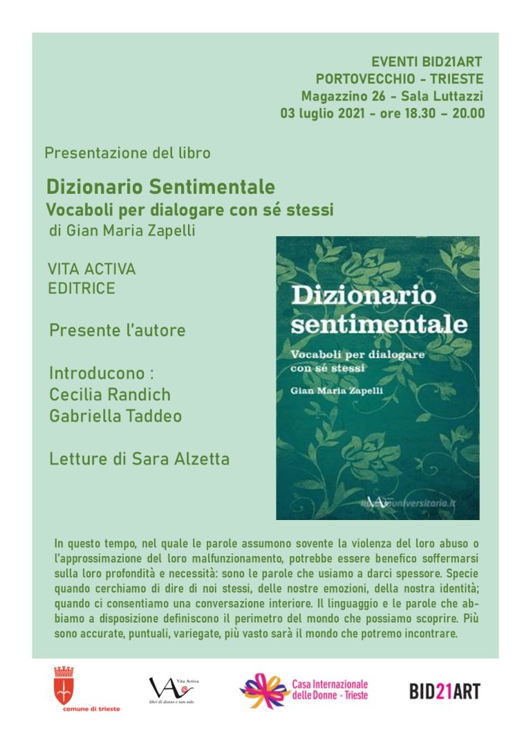 Un vero e proprio “Dizionario sentimentale” per aiutare a dialogare meglio con sè stessi. Questo il libro, edito dalla Casa Editrice indipendente VITA ACTIVA, che sarà presentato sabato 3 luglio alle 18.30 nella Sala Luttazzi del Magazzino 26 dall’autore Gian Maria Zapelli. Le parole hanno un potere speciale, possono ferire e possono curare. In un’epoca come quella attuale dove la violenza troppo spesso causa danni molto profondi, è utile poter contare su un aiuto atto a curare le ferite del cuore, che ci guidi a decodificare le nostre emozioni, a definire i sentimenti usando un linguaggio adeguato per riconquistare una propria identità e autostima.
