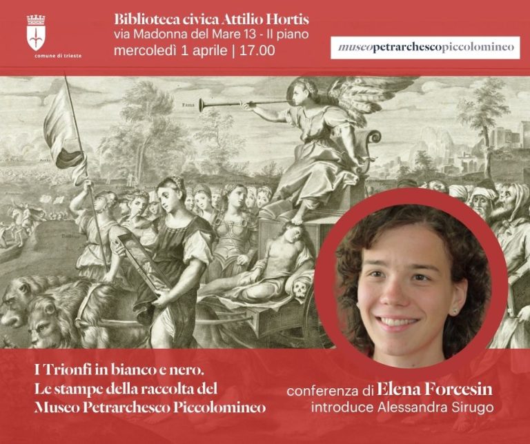 L’incontro, dal titolo I Trionfi in bianco e nero sarà introdotto da Alessandra Sirugo, responsabile del Museo Petrarchesco Piccolomineo di Trieste, e condotto da Elena Forcesin, storica dell’arte, ricercatrice in ambito storico-artistico e divulgatrice di contenuti storico-culturali e artistici. Nel corso della sua attività, Forcesin ha svolto ricerche in archivi pubblici e privati e su collezioni museali, approfondendo diversi aspetti legati alla storia dell’arte e alla valorizzazione del patrimonio.