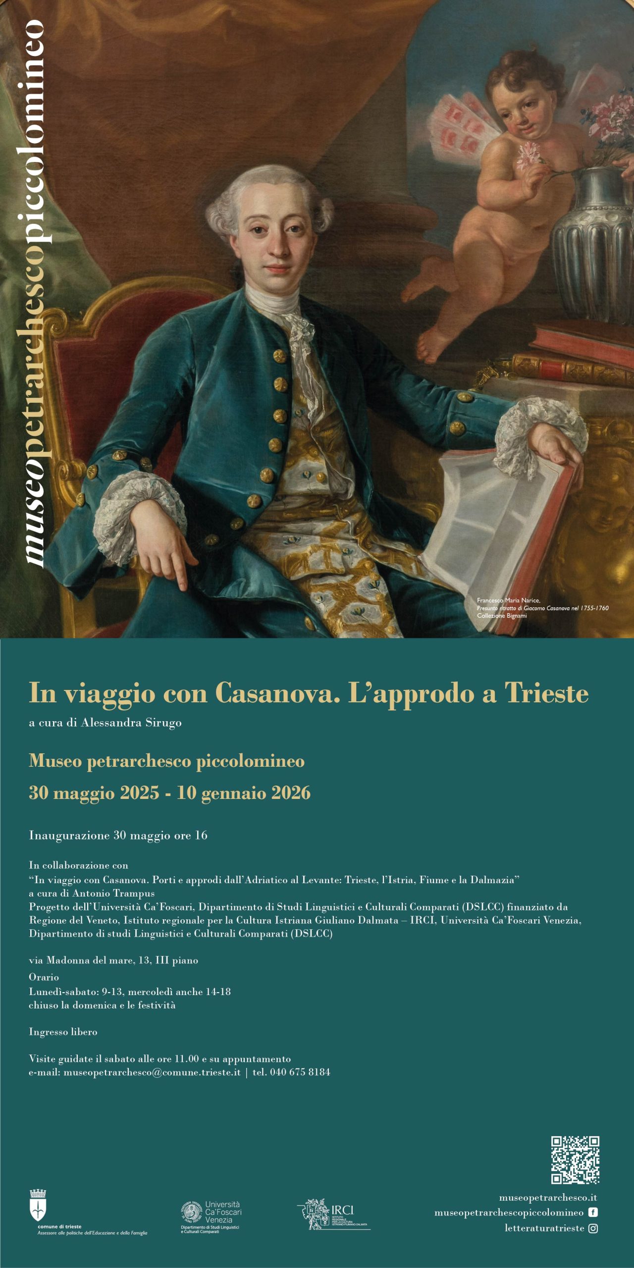 Nel 2025, anno in cui ricorrono i 300 anni dalla nascita di Casanova (1725-1798), il Civico Museo petrarchesco piccolomineo ricorda il periodo in cui lo scrittore ha vissuto a Trieste, dal 15 novembre 1772 al 14 settembre 1774, con la mostra “In viaggio con Casanova. L’approdo a Trieste” a cura di Alessandra Sirugo.