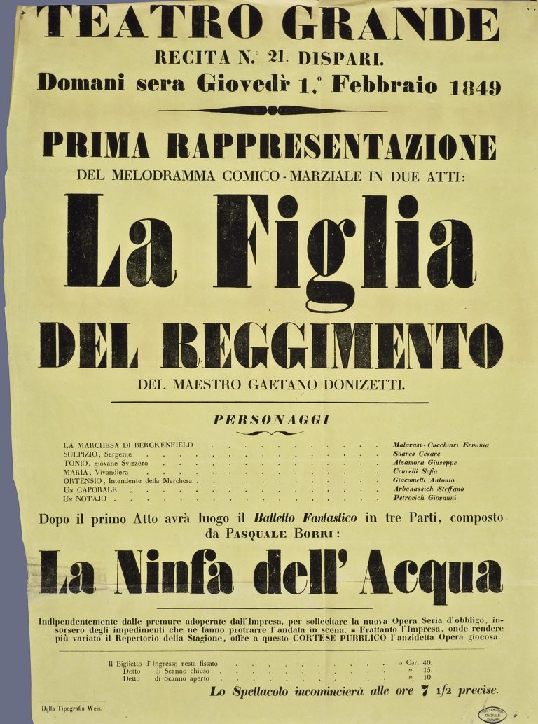Composta da Donizetti durante il suo soggiorno parigino, la «La fille du régiment» è un opéra comique in due atti su libretto di Jean Francois-Alfred Bayard e Jules Henri Vernoy de Saint-Georges. Andata in scena per la prima volta all’Opéra Comique di Parigi l’11 febbraio 1840 diretta dall’autore, l’opera, nella traduzione di Callisto Bassi, ebbe il suo debutto italiano alla Scala di Milano il 3 ottobre successivo e il suo ‘debutto’ a Trieste il primo febbraio del 1849. A quest’ultimo faranno seguito cinque ulteriori allestimenti; nel 1870, nel 1896, nel 1952, nel 1987 e nel 2009.