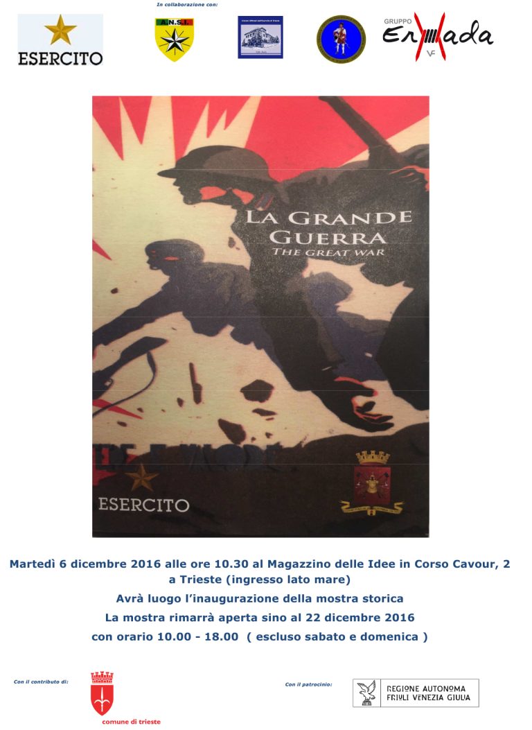 In occasione del Centenario della Grande Guerra, l’Esercito Italiano ed il Comune di Trieste, col patrocinio della Regione Friuli Venezia Giulia e la collaborazione il Gruppo Ermada ed il Centro Regionale di Studi Militari Antichi e Moderni di TRIESTE, promuovono la mostra itinerante su “la Grande Guerra” in programma al Magazzino delle Idee di Trieste dal 6 al 22 dicembre, con ingresso gratuito, dalle 10.00 alle 18.00 (escluso sabato e domenica). La rassegna espositiva sarà inaugurata ufficialmente martedì 6 dicembre, alle ore 10.30.Lo scopo che la mostra itinerante si prefigge è quello di consentire l’interazione degli Enti territoriali di F.A. con Istituzioni culturali e storiche locali, coinvolgendo le Associazioni Combattentistiche e d’Arma, i gruppi storici, e qualunque altra eccellenza di natura storico-culturale presenti nella Provincia.