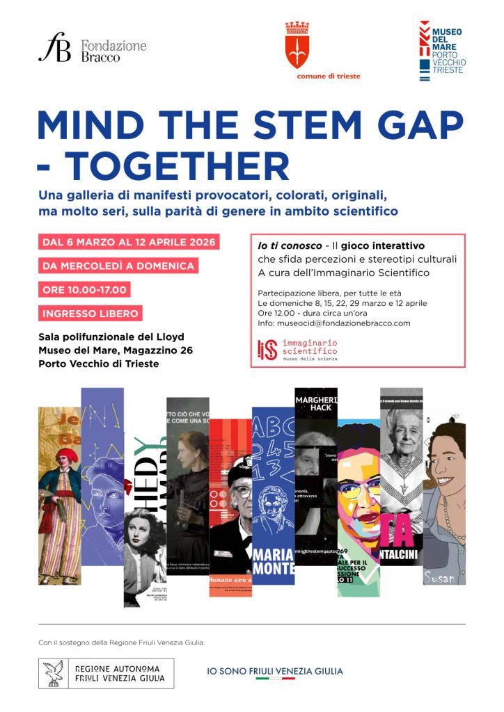 Aperta al pubblico dal 6 marzo al 12 aprile 2026 presso lo spazio polifunzionale della sezione Lloyd al piano rialzato del Magazzino 26, l’esposizione, che rientra nell’ambito degli eventi promossi dal Comune di Trieste per celebrare la Giornata Internazionale della Donna e che vede anche la collaborazione dell’Immaginario Scientifico, propone una galleria di manifesti eclettici, colorati e provocatori, realizzati da 150 studentesse e studenti che hanno interpretato “Mind the STEM Gap”, il Manifesto con cui Fondazione Bracco sostiene l’accesso femminile alle discipline STEM superando gli stereotipi di genere.