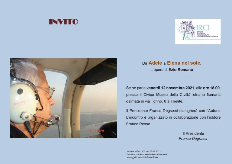 Venerdì 12 novembre presso la sede dell’IRCI/ Museo istriano, in via Torino 8, alle ore 18.00 verrà presentata l’opera di Ezio Romanò. Già dirigente in Fincantieri, dopo una vita votata al lavoro dagli inizi al CRDA, poi alla Grandi Motori e, infine, nel colosso della nostra cantieristica navale, esperienze con risvolti, in qualche caso, dai tratti romanzeschi, Ezio Romanò, pilota d’aerei per passione, dopo la quiescenza, svela anche una notevole vena narrativa e, dal 2007 con quel primo “Adele. Cronologia di un vissuto rimosso” ad oggi con “Elena nel sole”, scrive e pubblica ben otto romanzi. La presentazione dell’opera si svolgerà a cura dell’IRCI, in collaborazione con l’editore Franco Rosso, in un dialogo fra il Presidente Franco Degrassi e l’Autore.