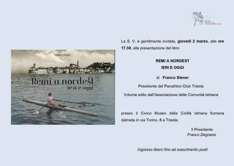 Giovedì 2 marzo, alle ore 17.30, l’I.R.C.I. – Istituto Regionale per la Cultura Istriana – fiumano – dalmata presso il Civico Museo della Civiltà istriana fiumano dalmata di Trieste, in via Torino 8, presenta il volume di Franco Stener “Remi a nordest. Ieri e oggi”.Il volume oltre a rappresentare un valido ricordo storico dello Sport del canottaggio sulle coste dell’Adriatico orientale, propone alcuni aggiornamenti cercando quanto continua a vivere della tradizione remiera in quell’Istria e Dalmazia dopo la seconda guerra mondiale. Un testo che ricorda i meritori sodalizi del passato ma che non vuole perdere di vista il futuro di quei giovani, discendenti di istriani in particolare, che hanno contribuito e contribuiscono all’affermazione del canottaggio triestino in campo nazionale.