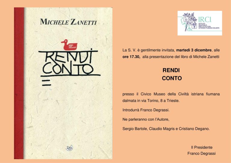 Presentazione del libro di Michele Zanetti “RENDI CONTO” che si terrà martedì 3 dicembre 2019, alle ore 17.30, presso il Civico Museo della Civiltà istriana fiumana dalmata di Via Torino, 8.Ne parleranno con l’autore: Sergio Bartole, Claudio Magris e Cristiano Degano.