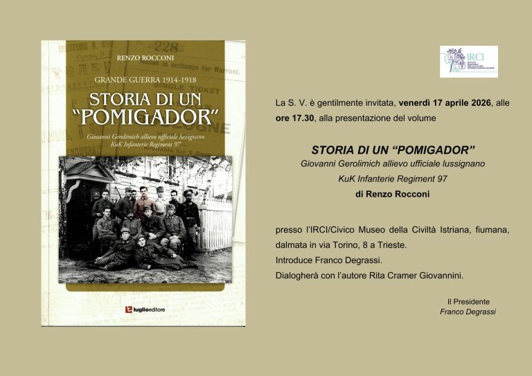 Venerdì 17 aprile, alle ore 17.30, l’I.R.C.I. – Istituto Regionale per la Cultura Istriano – fiumano – dalmata di Trieste, presenta il volume “Storia di un ‘Pomigador’”, presso il Civico Museo della Civiltà Istriana Fiumana e Dalmata, in via Torino 8.