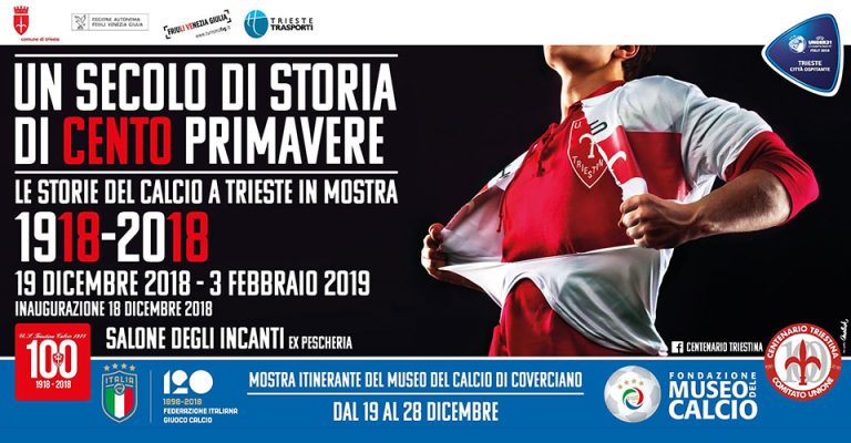 Culminano con l’inaugurazione della mostra “Un secolo di storia di cento primavere”, in programma al Salone degli Incanti martedì 18 dicembre p.v., le celebrazioni del Centenario della Triestina Calcio.Un’occasione per ripercorrere la storia della maggiore società agonistica di Trieste, ma anche per ripercorrere un secolo di storia sociale, economica, politica della città e del suo territorio; la sua costituzione nel dicembre 1918 – a poco più di un mese dalla fine della Grande Guerra – con la fusione di due preesistenti società calcistiche (Football Club Trieste e Ponziana), segna al tempo stesso il passaggio a un’epoca nuova e la continuità di una esperienza sportiva ereditata dagli inizi del Novecento.