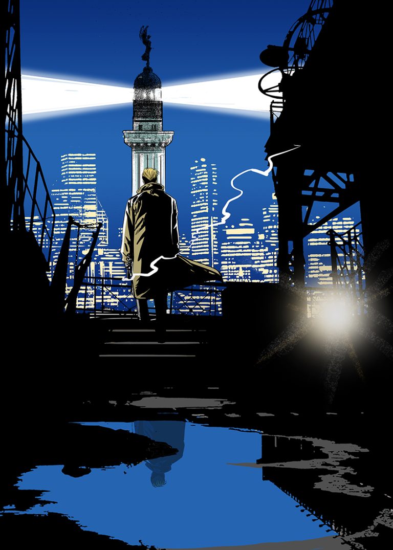 Nelle tavole esposte in mostra si riconosce piazza Unità d’Italia sorvolata da macchine spaziali, dove si