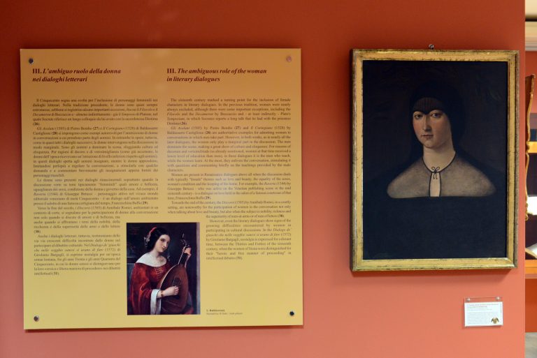 L’esposizione illustra la parabola della donna, che nel corso del secolo viene elogiata come “dea del cielo”, mentre a fine secolo verrà posto l’accento sulla sua condizione di “figlia di Eva”. Infatti tra la fine del Cinquecento e gli inizi del Seicento, l’atmosfera cambia. Dopo il Concilio di Trento, conclusosi nel 1563, mentre impallidisce il modello delle corti signorili, in letteratura l’atteggiamento misogino diventa più frequente.