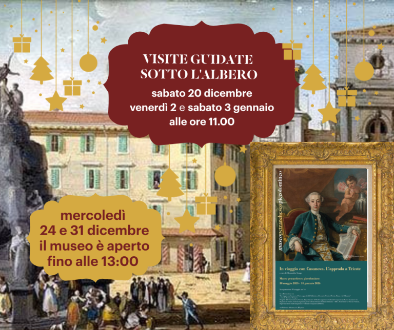 Il Museo Petrarchesco Piccolomineo di via Madonna del Mare, 13, organizza nel periodo delle festività natalizie, tre visite guidate alla mostra “Casanova in viaggio. L’approdo a Trieste” curata da Alessandra Sirugo in collaborazione con IRCI Istituto Regionale per la Cultura Istriano-Fiumano-Dalmata e l’Università Cà Foscari di Venezia.