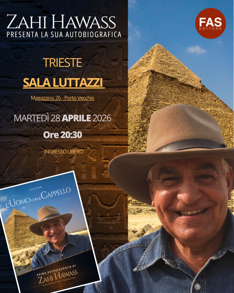 Tra le tappe più attese figura Trieste, che ospiterà il celebre archeologo ed egittologo in una serata-evento aperta al pubblico presso la Sala Luttazzi, all’interno del suggestivo complesso del Porto Vecchio – Magazzino 26.