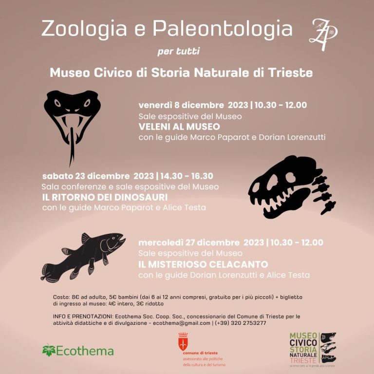 Ecothema Società Cooperativa Sociale, concessionaria per i servizi didattici, educativi e di divulgazione culturale dei Musei Scientifici del Comune di Trieste, presenta la serie di attività ‘Zoologia e Paleontologia per tutti’ che si svolgeranno al Museo Civico di Storia Naturale durante il mese di dicembre.