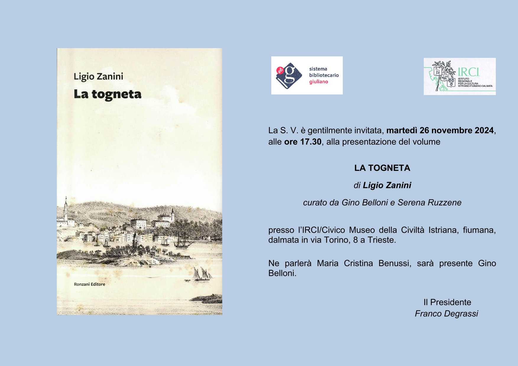 Istituto per la Cultura Istriano Fiumano Dalmata Via Duca d'Aosta, 1Martedì 26 novembre alle ore 17.30 presso la sede dell'IRCI/Museo istriano di via Torino n. 8, verrà presentato il libro "La togneta" di Ligio Zanini, curioso volume che descrive la popolare pesca con la "togna", cioè la lenza a mano. L'operetta è molto di più di un semplice "manuale": è anche un'eccentrico profilo antropologico di […]
