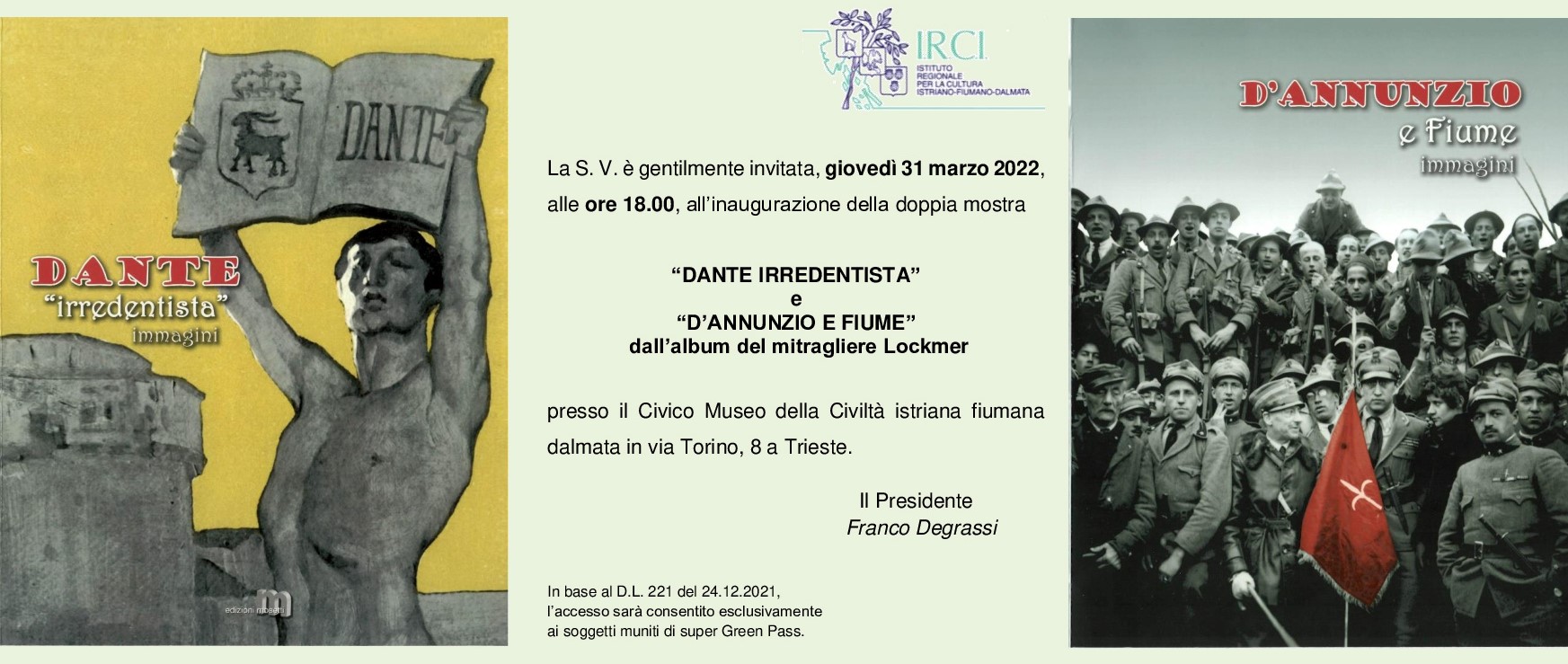 Museo della Civiltà Istriana Fiumana e Dalmata via torinoGiovedì 31 marzo alle ore 18.00 inauguriamo, al museo istriano in via Torino, due mostre in contemporanea, entrambe curate dall'IRCI. Le mostre sono distinte ma, se vogliamo trovare un filo conduttore, questo sta nel termine "immagini". Da una parte vediamo come viene usato il volto (e la parola) di Dante fra la fine dell'800 e […]